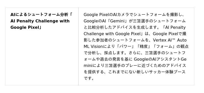 12月25日にTOYOTA ARENA TOKYOで開催されるファイナルのauブースでは、昨年ご好評をいただいたGoogle Pixel(TM)とGoogleのAIアシスタントGemini(TM)に三笘選手の知見を組み合わせたシュートフォーム分析を2年連続で提供します。参加者のシュートフォームを「パワー」、「精度」、「フォーム」の観点で分析し、三笘選手のプレーに近づくためのアドバイスを提供します。