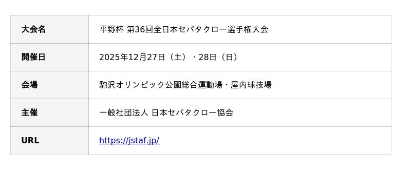 セパタクローは、ネットを挟んで足や頭を使ってボールを蹴り合う、そのアクロバティックなプレーから「空中の格闘技」とも呼ばれる東南アジア発祥のスポーツです。「平野杯 第36回全日本セパタクロー選手権大会」は、2025年度に開催された国内のレグ戦(3人制)における対象大会の戦績により出場権を獲得したレグのみが集結する、国内最高峰の大会です。全国のトッププレーヤーが集結し、日本一の座をかけて熱戦を繰り広げます。【大会概要】