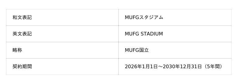 株式会社ジャパンナショナルスタジアム・エンターテイメント(以下、JNSE)と株式会社三菱UFJフィナンシャル・グループ(以下、MUFG)は、国立競技場を世界トップレベルのナショナルスタジアムにするというビジョンのもと、2026年1月より国立競技場の呼称(※)を「MUFGスタジアム」として始動していくことをお知らせいたします。