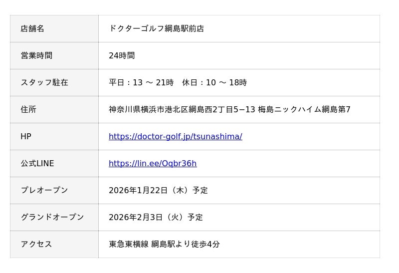 株式会社MIC(本社:神奈川県横浜市、代表取締役社長:増田信夫)は、2026年2月3日(火)にグランドオープン予定のインドアゴルフ練習場「ドクターゴルフ綱島駅前店」(所在地:神奈川県横浜市港北区綱島西2丁目5−13 梅島ニックハイム綱島第7)について、2026年1月8日(木)より無料体験予約の受付を開始します。