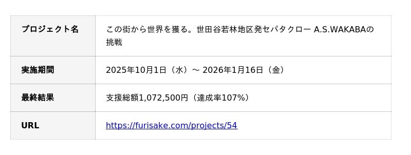 東京都世田谷区若林地区を拠点に活動するセパタクローチーム『A.S.WAKABA』(代表:平瀬 律哉)は、2025年10月1日(水)より実施していたクラウドファンディングプロジェクトにおいて 、目標金額1,000,000円に対し、最終達成率107%(総額1,072,500円)で終了したことをご報告いたします。