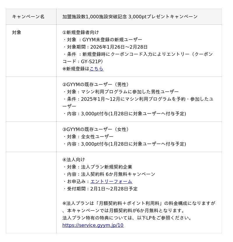 - GYYM/加盟施設数1,000施設突破を記念し3,000ポイントプレゼントキャンペーンを実施