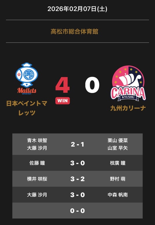 ノジマTリーグ 2025-2026シーズン 公式戦 2月7日(土)開催 「日本ペイントマレッツ vs 九州カリーナ」の試合は、4-0で日本ペイントマレッツが勝利しました。