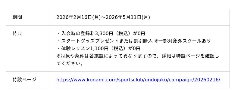コナミスポーツ株式会社が運営する「コナミスポーツクラブ」の子ども向けスクール「運動塾」では、2026年2月16日(月)~5月11日(月)まで春のキャンペーンを実施します。
