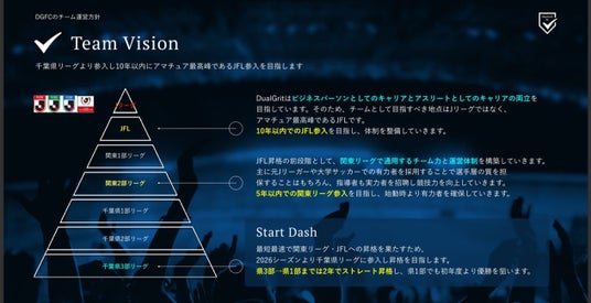 Dual Grit FCは、アマチュア最高峰であるJFLを最終到達点と定め、10年以内での参入を目標に段階的な強化を進めます。