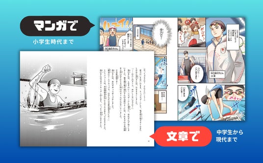 本書の制作にあたり、池江選手へ8カ月間にわたる取材を実施。競泳をはじめた3歳から小学生時代までをマンガでいきいきと、中学生時代から世界水泳2025までを臨場感ある文章で再現しました。文章は児童文学を数多く手がけ、みずみずしい筆致に定評のある作家・北川チハル氏。手に汗握るレース展開や、オリンピックを夢見た中学3年生の夜、医師から白血病と告げられた病院での涙、復帰後に思うようなレースができず泣き崩れた日の母とのドライブのシーンなど、池江選手の半生を読者が追体験できるような、真に迫った描写が本書の大きな魅力です。