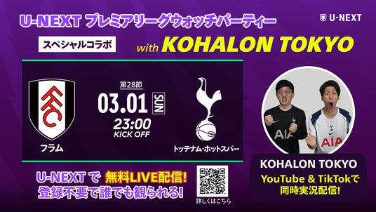 USEN&U-NEXT GROUPの株式会社U-NEXT(本社:東京都品川区、代表取締役社長:堤 天心)が運営する動画配信サービス「U-NEXT」は、2026年3月1日(日)に行われるプレミアリーグの無料ライブ配信『フラム vs トッテナム・ホットスパー』にあわせて、人気クリエイター「KOHALON TOKYO」とのコラボレーションによるウォッチパーティーを開催いたします。