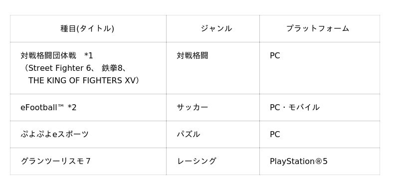 「Street Fighter 6」、「eFootball(TM)」、「グランツーリスモ7」の出場選手については、現在、大会等による選考を準備しています。決定次第お知らせしていきますので、引き続きご注目ください。
