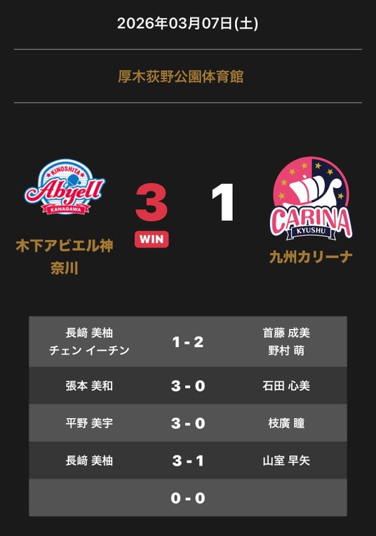 - ノジマTリーグ 2025-2026シーズン 公式戦 3月7日(土)開催 木下アビエル神奈川 vs 九州カリーナ 試合結果