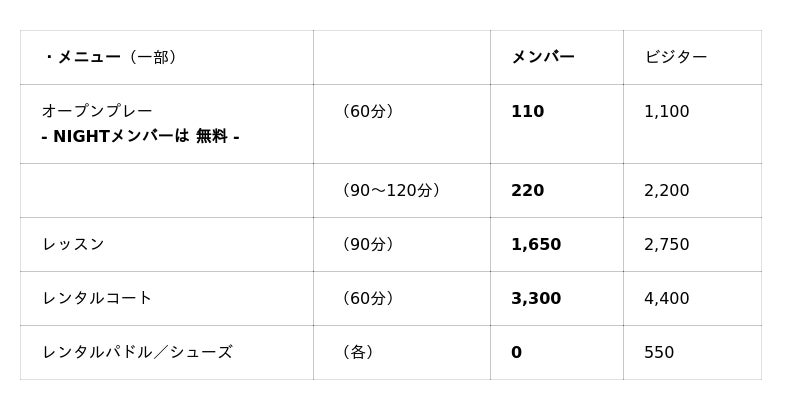 レンタルコート割引/レッスン割引/イベント 割引/イベント優先予約/会員限定 イベント等/プロショップ 特典 が適用されます。