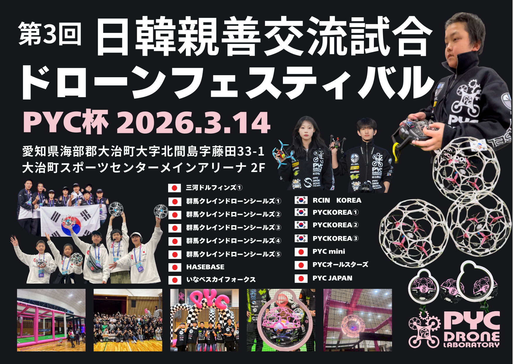 「第3回 日韓親善交流試合 ドローンフェスティバル PYC杯」を、2026年3月14日、愛知県大治町の大治町スポーツセンターにて開催します。