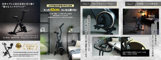 本製品の開発において着目したのは、累計30万件超のレビュー分析から見えてきた「運動しようと思うと億劫になってしまう」「都度片付けるのが面倒」といった運動そのものではなく、日常の中に存在する【続けるまでのハードル】でした。日常に存在する習慣化を阻む壁を、機能面だけではなくデザイン面からも解決するべく『MONOQLO』創刊200号記念【MQ the BEST 200】に選出された「STEADY 背もたれ付きフィットネスバイク」の高い静音性と機能性をベースに、よりインテリアに調和するマットブラック×ゴールドのデザインと折りたたみ時わずか42cmのスリム設計を採用。空間に自然と馴染み、あえて出して置きたい洗練されたデザインに仕上げることによって運動への一歩を軽くする、インテリア発想のフィットネスバイクです。