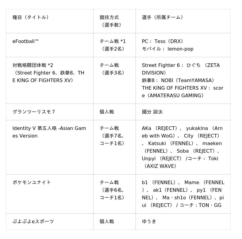 3月21日(土)と22(日)の2日間、愛知・名古屋アジア大会の競技会場でもあるAichi Sky Expoにて実施した最終選考競技会において、「対戦格闘団体戦」、「eFootball(TM)」、「ぷよぷよeスポーツ」、「グランツーリスモ7」の日本代表候補選手が決定しました。