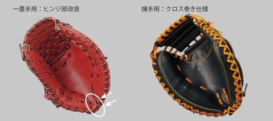 3.一塁手用はヒンジ部改良で握り込みしやすく、捕手用はクロス巻き仕様でミットの良い状態を長く維持できるプロ仕様構造を搭載。