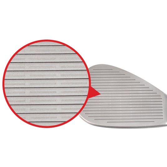 ■精密なフェース加工による超スピン性能フェース面全体に及ぶスコアライン (フルスコアライン) と溝間の加工 (レーザーリブ) を採用することで、 ルール適合ながら、フルショットはもちろんフェースを開いた時にトウ側でヒットしても、確実にスピンが得られます。さらにフェース面が大きく見えて優しく感じる効果もあります。