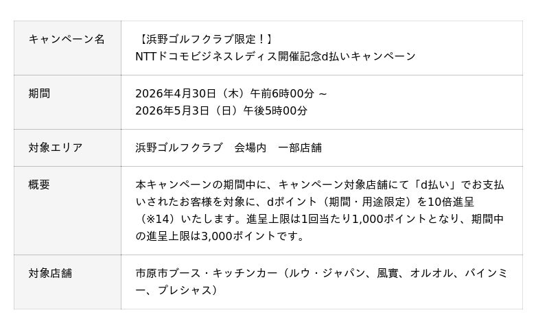NTTドコモビジネス株式会社(旧 NTTコミュニケーションズ株式会社、以下、NTTドコモビジネス)と株式会社NTTドコモ(以下、NTTドコモ)は、両社が協賛する一般社団法人日本女子プロゴルフ協会(JLPGA)公認の女子プロゴルフトーナメント「NTTドコモビジネスレディス」(以下、本大会) に合わせて、各種イベントやキャンペーンを開催します。