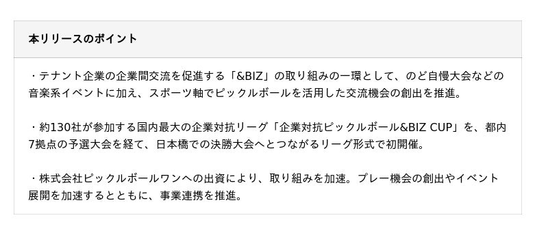 当社では、新宿三井ビルディングにおいて1975年より開催し、今年で49回目を迎える「会社対抗のど自慢大会」など、テナント企業が参加するイベントを通じて企業間の交流やコミュニティの形成に取り組んできました。「企業対抗ピックルボール&BIZ CUP」についても、こうした取り組みの考え方を踏まえ当社を代表する企業参加型イベントの一つとして定着させていくことを目指してまいります。