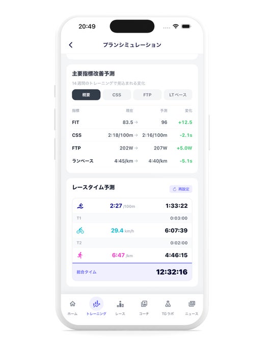 トレーニングを計画通り実施すると、パフォーマンス指標がどれだけ改善し、どのくらいのタイムで完走できるかを、運動生理学に基づく独自のアルゴリズムで予測を行う。