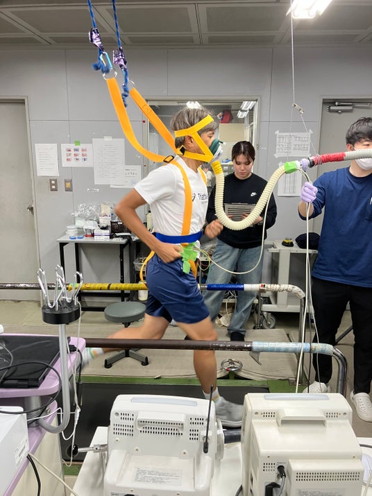 開発者の堤裕次郎。大学院研究室でのVO2max測定の様子。