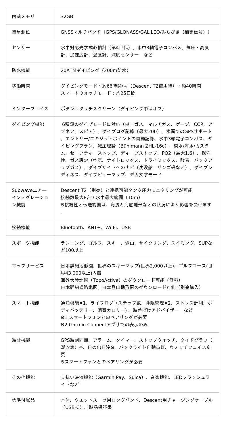 - 堅牢さと水中操作性を両立。防水気圧は20ATM本体にはキズのつきにくいサファイアレンズを採用し、米国防衛装備品のための規格MIL-STD-810に準拠したタフネス設計。20ATM(200m)防水機能(https://www.garmin.com/ja-JP/legal/waterrating-definitions/を参照)で、100mを超えるフリーダイビングを含め、あらゆるダイビングに対応しています。また、時計右側には深度センサーを守るボタンガードを装備。