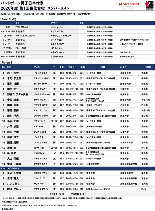 公益財団法人日本ハンドボール協会は、男子日本代表「彗星JAPAN」が2026年5月4日から5月9日まで東京都の味の素ナショナルトレーニングセンターで実施する2026年度第1回強化合宿のメンバーを、下記のとおり決定しましたのでお知らせいたします。