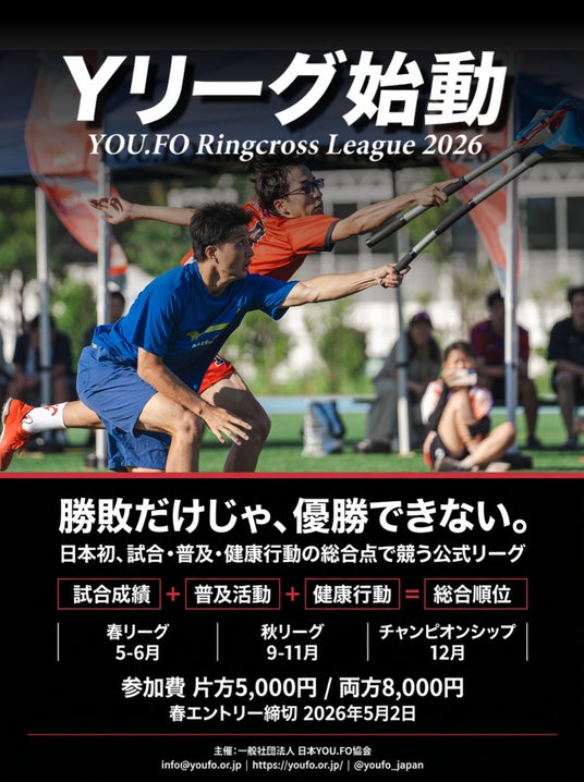 一般社団法人日本YOU.FO協会は、Yリーグを通じて、YOU.FO Ringcrossを「新しいスポーツ」から「続ける競技」へと発展させ、競技性と社会性の両面を備えた日本独自のリーグとして国内での定着と発展に取り組んでまいります。━━━━━━━━━━━━━━━━━━━━━━━