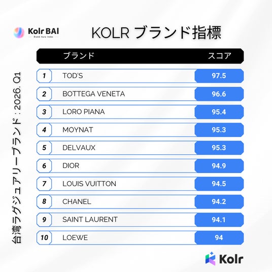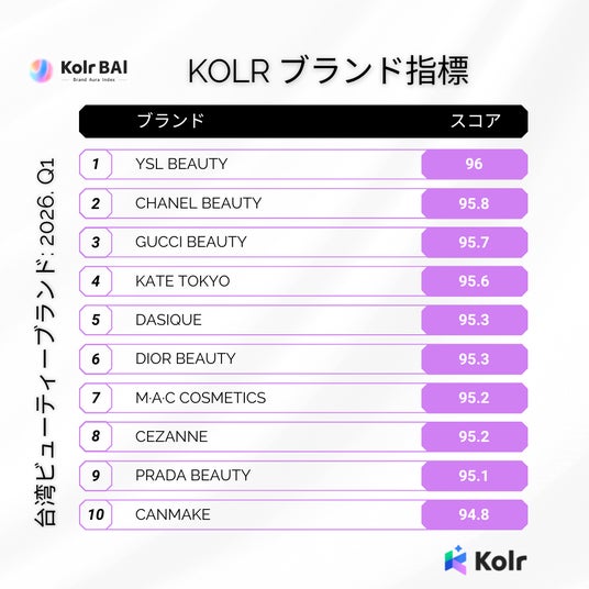 iKalaグループが提供するマーケティング・インテリジェンス・ソリューション「 Kolr」 は、アジア市場におけるブランドのインフルエンサーマーケティングの成果を評価するランキング「Brand Aura Index」2026年第1四半期版を発表しました。今回のレポートでは、台湾のラグジュアリー市場およびビューティー市場におけるインフルエンサーマーケティングの成果を分析しています。