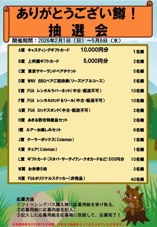 1.ありがとうござい鱒!抽選会フィッシングパス購入で応募用紙を1枚お渡しし、抽選で合計100名様に豪華景品をプレゼント!