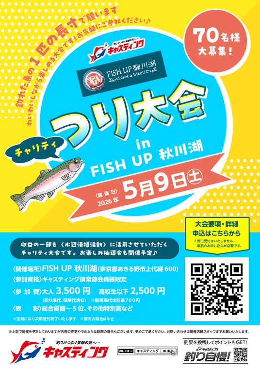 FISH UP 秋川湖の閉場後に「釣具のキャスティング」主催のチャリティー釣り大会を開催いたします。お楽しみ抽選会も開催予定で、どなたでもお気軽に楽しめます!なお、収益の一部は水辺清掃活動に活用させていただきます。