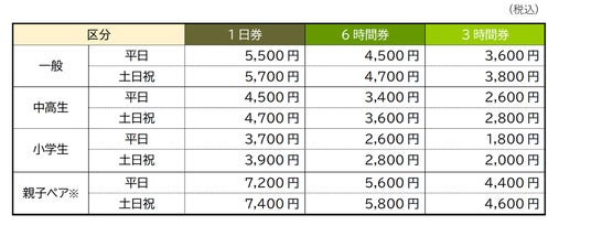 料金:土日祝日料金を適応し、1日券では最大13時間利用可能