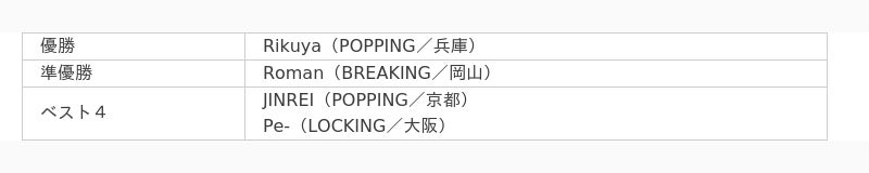 ダンスのプロリーグで活躍する「Dリーガー」を含む豪華ダンサーたちがジャッジを務める中、3on3バトルは、“Butterfly effect(二松学舎大学附属高等学校)”が優勝。1on1バトルは、第8回大会でベスト4だった“Rikuya(POPPING/兵庫)“が雪辱を果たし、チャンピオンの栄冠を掴んだ。