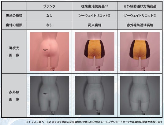 今回追加する盗撮対策モデルは、近赤外線領域の吸収性に非常に優れた特殊な繊維で構成された赤外線防透け裏地を採用しました。特殊な繊維が人体側からの赤外線を吸収することで、赤外線カメラに対する防透け性を向上し、特に女性アスリートを守り、競技に集中できる環境をサポートします。