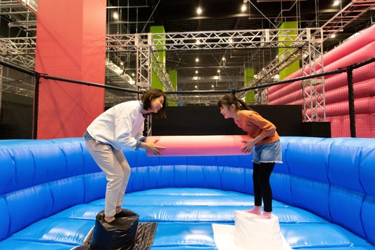 でっかい棒を二人で持って押し相撲!相手のバランスを崩しお立ち台から落とそう!