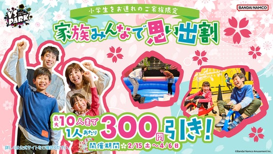 株式会社バンダイナムコアミューズメントが運営する屋内“ヤバすぎ”アクティビティ施設『VS PARK』では、2025年2月15日(土)から4月6日(日)までの期間、小学生のお子さまと一緒に家族・グループで来店し、指定のクーポンを提示すると、120分料金が1人あたり300円引きになる「家族みんなで思い出割」を実施します。