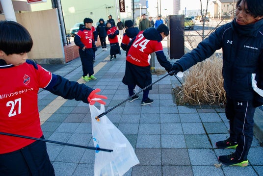 今年は一般からの応募者数は過去最多人数に達しましたが、開催当日は全国的な大寒波。その影響でいわき市外からの参加者からは「雪で家から出られそうにない」「交通路がどうなっているのか分からず向かえない」など、多くのキャンセルがありました。一方いわき市内はかなりの強風でしたが快晴で、参加できなかった方々の分もみんなでしっかりごみを拾いました。また今回、いわきFCの協力でオリジナルのステッカーを参加賞として配布。U-13のメンバーやスタッフ、そして多くのサポーターも参加してくれました。