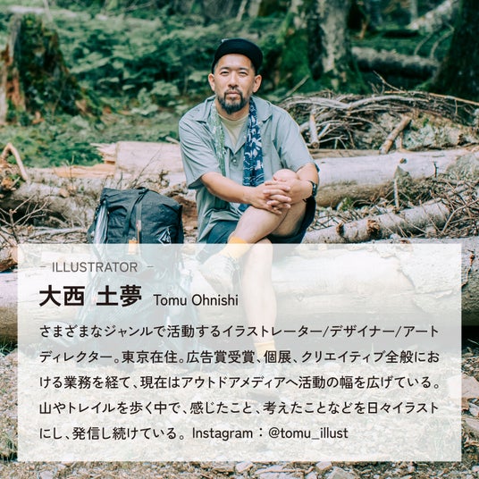 ハイカーにファンが多い大西氏のイラスト、自国の言葉で描かれた乾杯のフレーズ。