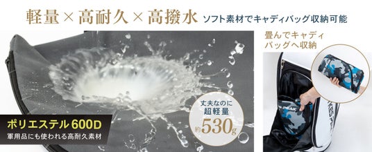 1.驚きの軽さ!わずか530g 軽さの秘密は、薄くて軽い撥水ポリエステル生地。長時間の持ち運びも負担を感じさせません。さらに、水や汚れに強い素材のため、突然の雨や屋外での使用も安心です。
