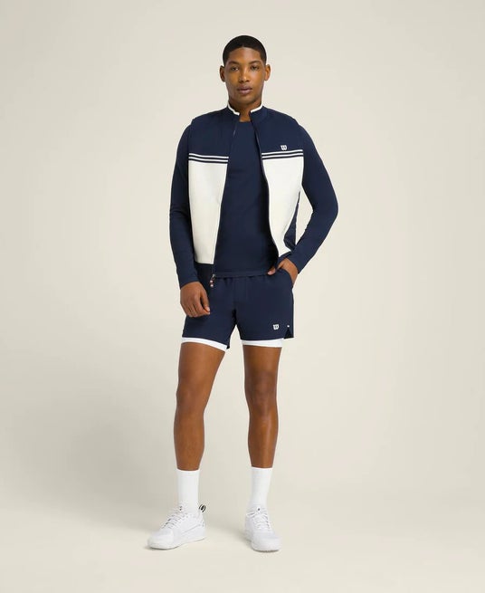 伸縮性のある生地を使用し、簡単に着脱できるハーフジップを備えているため、ウォームアップやコートへの行き帰りに最適な1枚。ドローコード付き。