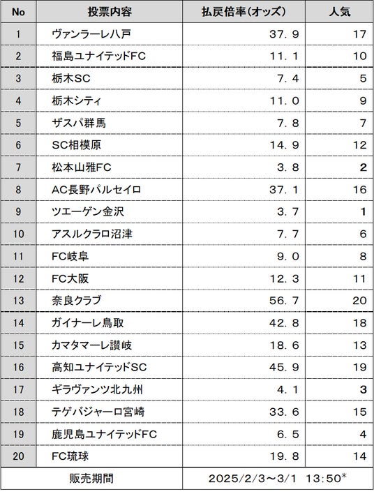 1番人気は、昨シーズン12位のツエーゲン金沢で、払戻倍率(オッズ)は3.7倍!2番人気は、昨シーズン4位の松本山雅FCで、払戻倍率(オッズ)は3.8倍、3番人気は、昨シーズン7位のギラヴァンツ北九州で、払戻倍率(オッズ)は4.1倍となっています。