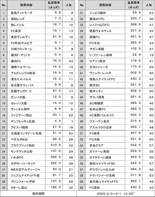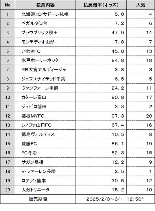 1番人気は、昨シーズン3位のV・ファーレン長崎で、払戻倍率(オッズ)は2.5倍!2番人気は、1年でのJ1復帰を目指すジュビロ磐田で、払戻倍率(オッズ)は3.3倍、3番人気は、J3から昇格したRB大宮アルディージャで、払戻倍率(オッズ)は3.8倍となっています。