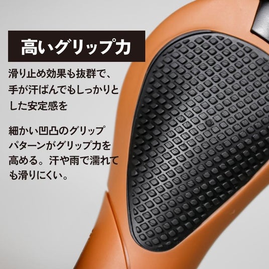 耐久性と耐摩耗性、耐滑り性、耐衝撃性に優れています。 手に吸い付くようなグリップ感です。