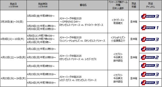 - 「メジャーリーグベースボール(MLB)2025」アメリカ開催の大谷翔平・山本由伸・佐々木朗希(ロサンゼルス・ドジャース)先発出場試合を全試合放送!そのほか、日本人注目選手の出場試合を中心に連日放送!