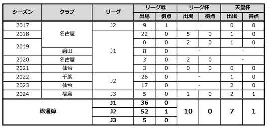 サッカー歴:ジェフユナイテッド千葉U-15→流通経済大付属柏高→早稲田大→名古屋グランパス→ジュビロ磐田→名古屋グランパス→ベガルタ仙台→ジェフユナイテッド千葉→ベガルタ仙台→福島ユナイテッドFC