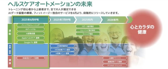 会員様により健康に明るく楽しい人生を送っていただくため、運動のほか健康的な生活を送るために欠かせない「食事」と「睡眠」の領域においてもAIテクノロジーを駆使し、生活習慣の改善や予防医療の促進に寄与できる仕組み作りを実施してまいります。